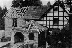 Nachdem ein Kamin gemauert war, ein Jahr später das Schleppdach aufgestockt und ein Windfang gearbeitet war, wurde die Hütte in den Jahren 1958-1960 unterkellert - der Boden mit Kohlenschaufeln von innen per Hand ausgehoben. Im Keller entstanden Kohlenkeller, Skistall und zwei Waschräume mit WC. Die Skihütte platzte am Wochenende "aus allen Nähten". Am 2.6.1960 erfolgte dann die Baugenehmigung zum Anbau des Seitentrakts – 3.650 ehrenamtliche Arbeitsstunden leisteten die Vereinsmitglieder, überwiegend am Wochenende.